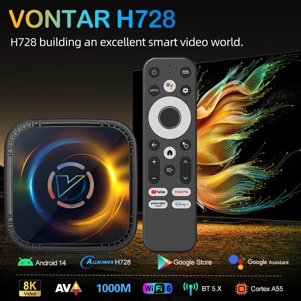 Vontar H728 працює під керуванням операційної системи Android 14, має встановлений медіаплеєр KODI 17.3 та повний доступ до Google Play маркет із тисячами додатків.